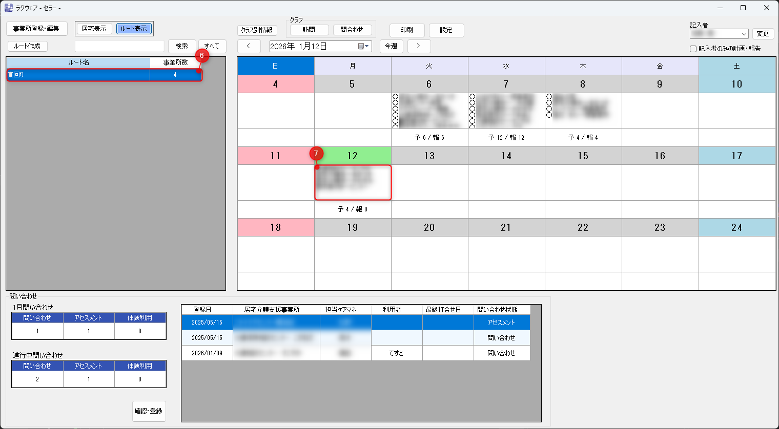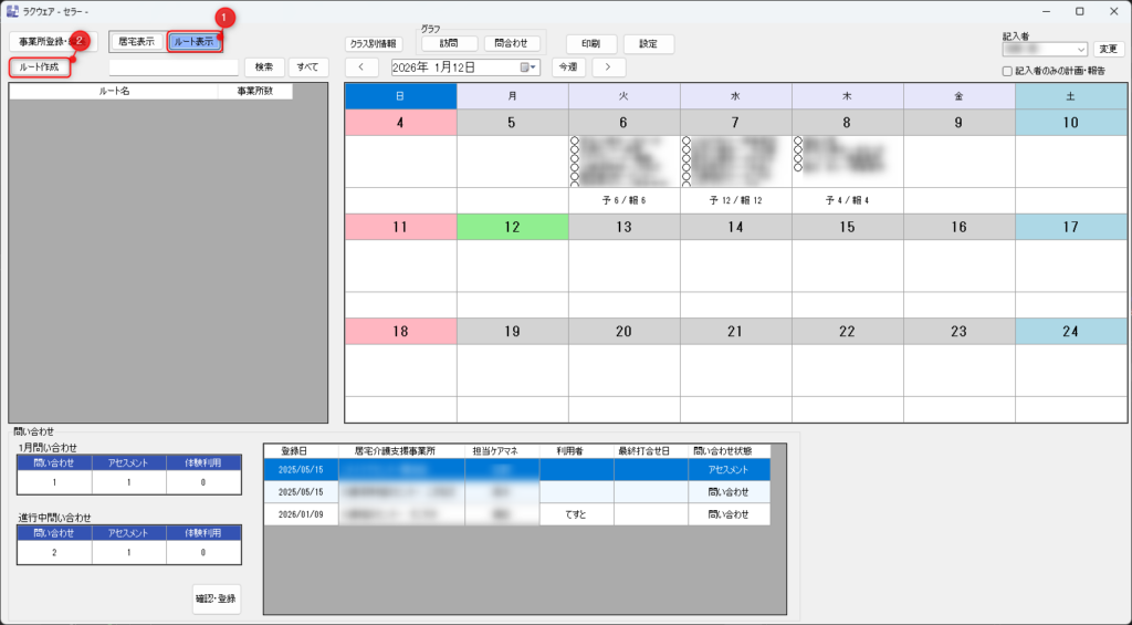 作成済みのルートがある場合は「ルート表示」画面で表示されます。訪問予定居宅の選択と同じようにルートをドラッグ&ドロップすると、 そのルートの居宅がドロップした日に訪問予定として追加されます。