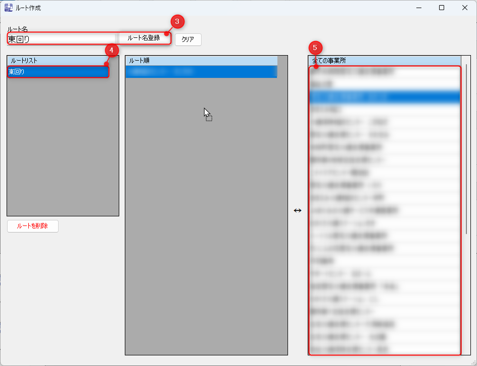 ③ルート名を入力し「ルート名登録」を押す。④登録したルートを選択して、「すべての事業所」リストから 「ルート順」リストに事業所をドラッグ&ドロップする。