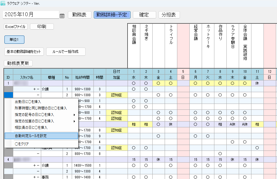 メイン画面の勤務詳細で、設定したい勤務詳細行の「ID列」をクリックし、「自動判定ルールを設定」をクリックします。