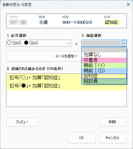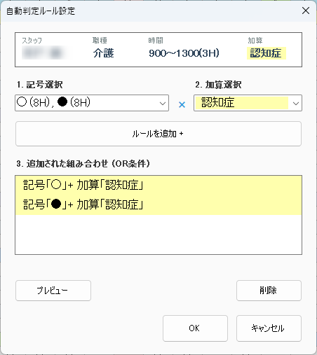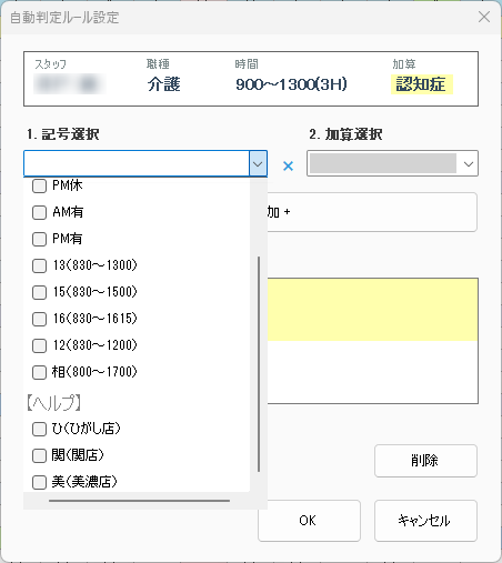 「自動判定ルール設定」ダイアログが開いたら、シフト記号と加算を選択し「ルールを追加」をクリックします。