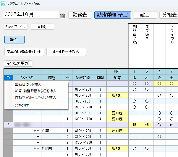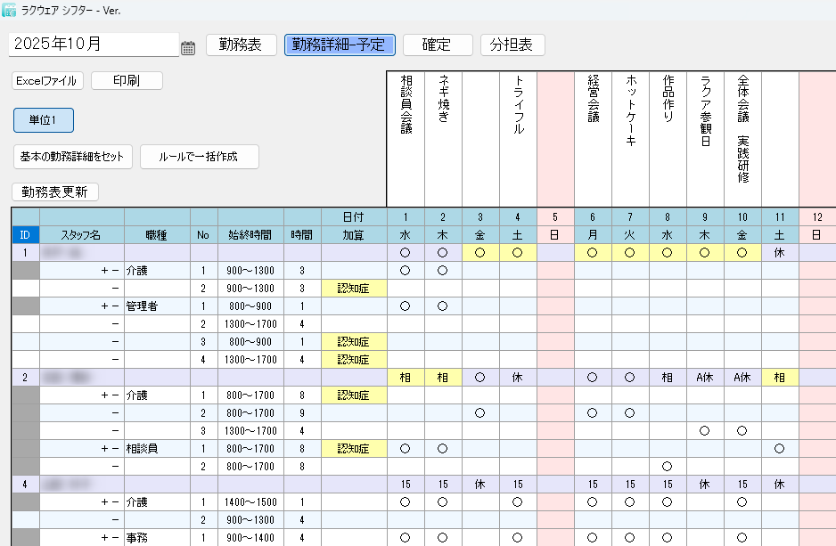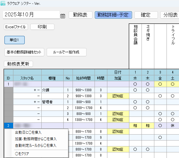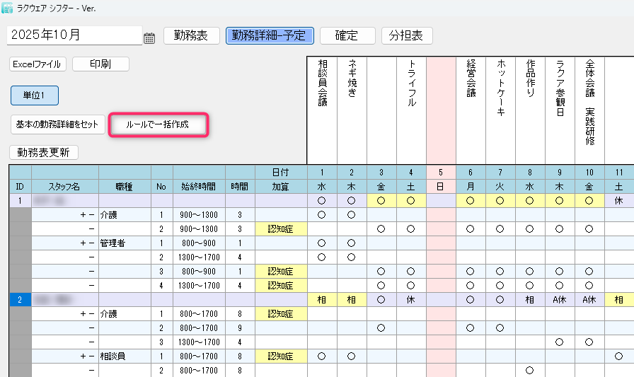 「ルールで一括作成」をするとルールが設定済みの勤務詳細行のみがセットされます。